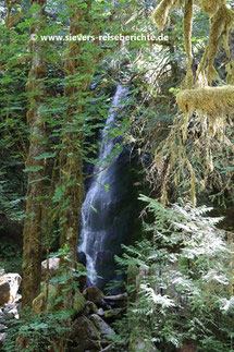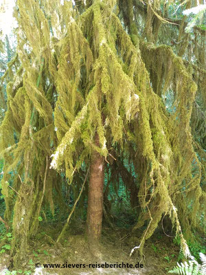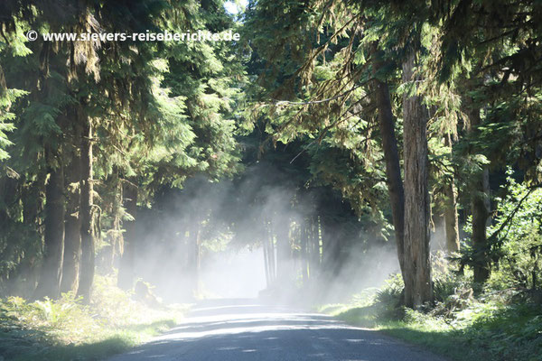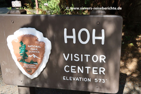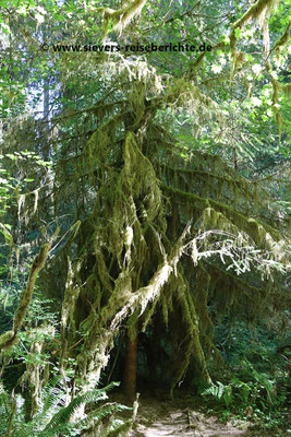 Weiter ging es Richtung Hoh Rain Forrest Visitor Center im Olympic National Park. Hier hat eine Flutwelle des Hoh River anscheinend die Straße stark beschädigt. An mehreren Stellen war die Straße nur einspurig befahrbar. Wir mussten dann vor dem Kassenhäuschen 30 bis 40 Minuten warten, weil immer nur ein Fahrzeug in den Park gelassen wurde wenn ein anderes Fahrzeug rausgefahren ist. Aber schließlich hatten wir es dann endlich geschafft und sind am Hoh Rain Forrest Visitor Center angekommen. Hier hätte es heute gerne etwas neblig sein können oder sogar regnen dürfen, dann hätte das hängende Moos bestimmt besser gewirkt.
